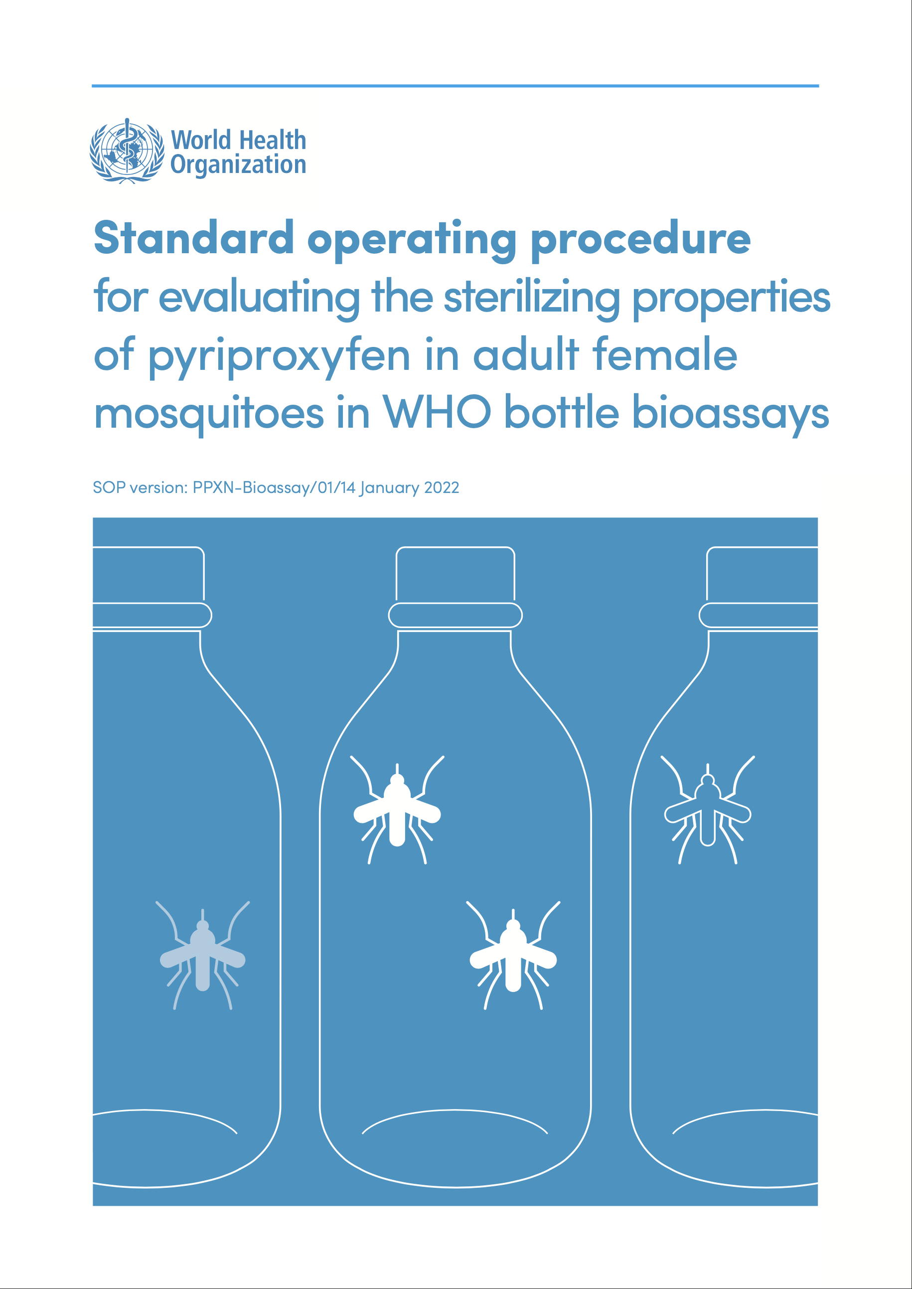 This (standard operating procedure) SOP describes the process of exposing mosquitoes to pyriproxyfen in glass bottles, chambering mosquitoes for oviposition after exposure, and recording and interpreting test results. The SOP complements the WHO SOP for testing insecticide susceptibility of adult mosquitoes in WHO bottle bioassays.