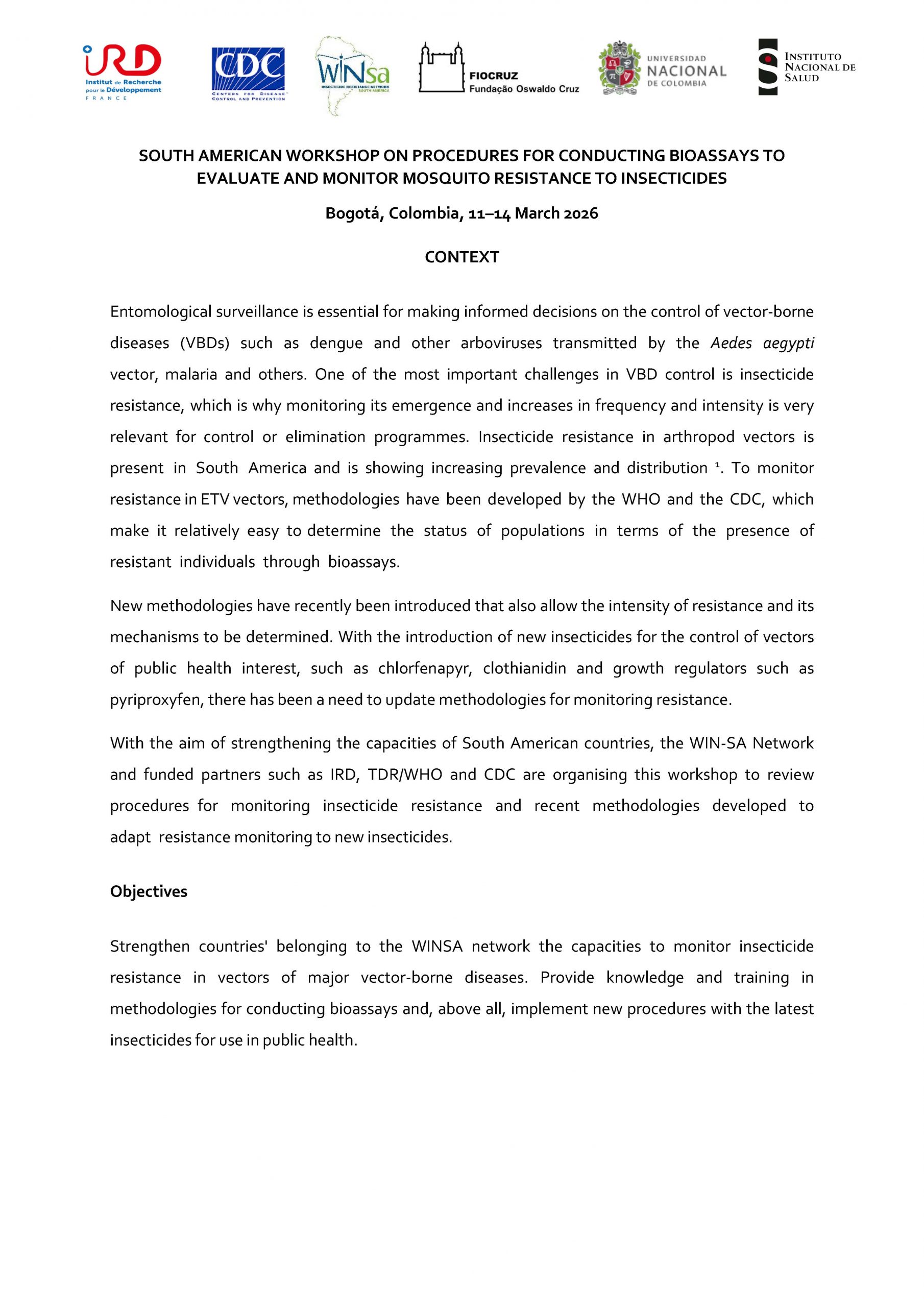 SOUTH AMERICAN WORKSHOP ON PROCEDURES FOR CONDUCTING BIOASSAYS TO EVALUATE AND MONITOR MOSQUITO RESISTANCE TO INSECTICIDES