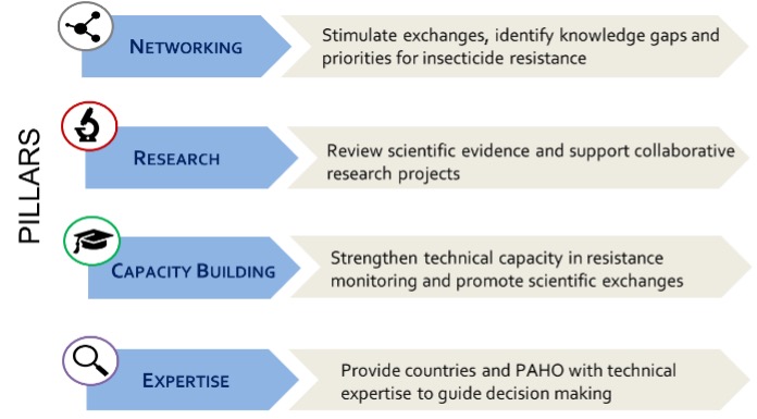 The network relies on 4 pillars of actions in order to raise awareness, fill knowledge gaps and strengthen research & training capacities on vector resistance surveillance and management in South America (Fig. 1)