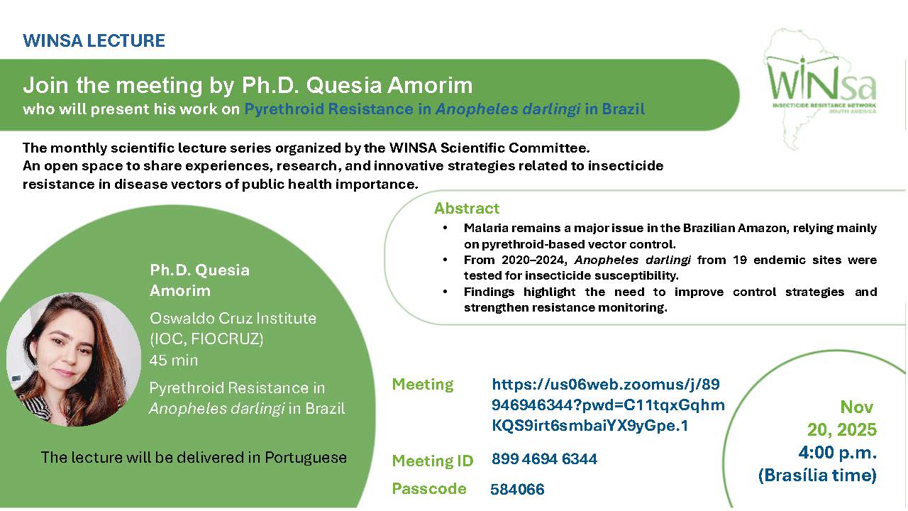 WINSA Lecture N°4 by Dr. Quesia Amorim who will present his work on innovative strategies as alternatives to insecticide resistance