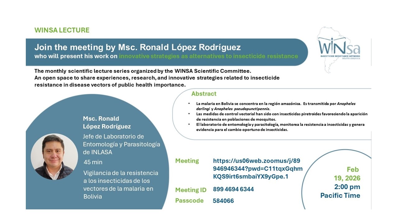 WINSA Lecture N°7 by MSc. Ronald López Rodríguez, who will present his work on innovative strategies as alternatives to insecticide resistance